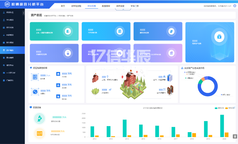 強化資產管理是推進預算制度改革的重要內容,也是部門預算有效執行的重要保證。資產概括頁面通過分析學校各類型資產的存量和分布情況,可以提高資產的利用率,從而指導探索進一步管好用好高校資產的方法與途徑。如下圖: