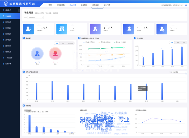 學生概括展現出學生的基本屬性、人數分布、學籍情況、借閱與消費、畢業與就業等指標。如下圖: