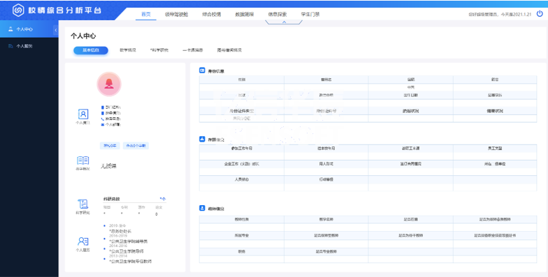 高校師資隊伍建設的優劣決定了高校人才培養質量的高低。如何在大數據時代科學利用源于高校各個層面的海量數據,并使之成為高校師資隊伍建設的參考與方向,是眾多高校需要解決的問題。師資隊伍頁面通過展現教職工主要的屬性指標,分析了目前高校師資隊伍建設中所存在的問題,對加強高校師資隊伍建設起到指導作用。如下圖: