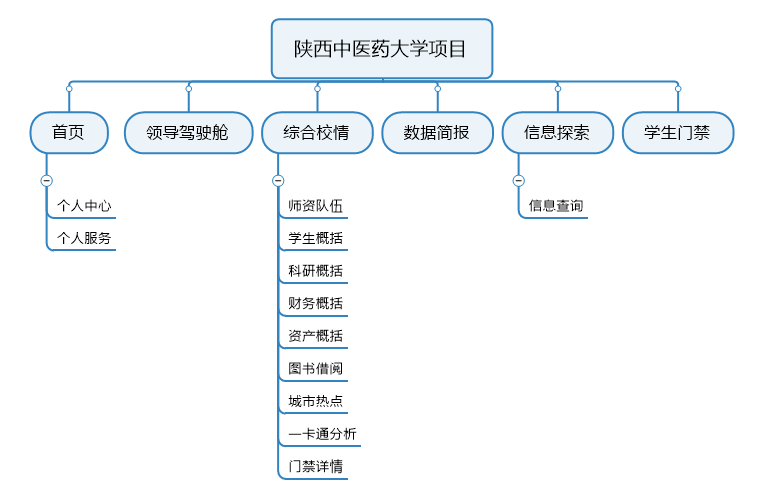 陜西中醫藥大學數據分析平臺項目,涉及內容包括首頁、領導駕駛艙、綜合校情、數據簡報、信息探索和學生門禁等各項內容。平臺項目功能架構圖如下: