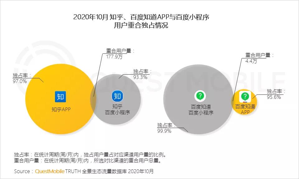 除了同一個app獨占率自己的對比, 同種類型的app的獨占率還做了對比. 比如百度知道app 獨占率 95.6%, 宣布內附知乎app 獨占率(97.0%)略低。但百度小程序的獨占率(99.0%)要大大高于 知乎小程序的獨占率 93.3%。