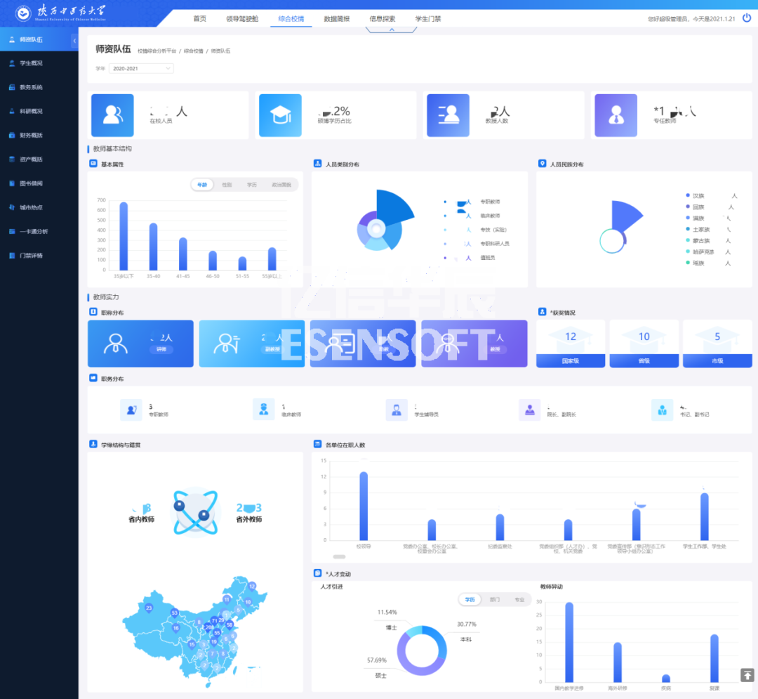 豐富的校情可視化數據看板 在綜合校情查詢與主題分析角度,對教務教學、科研、資產、財務、人事與學生管理、一卡通等業務,進行結構、趨勢、分布等綜合分析,讓各級領導一屏在手,掌握全局,多種指標實時隨地呈現,助力科學決策。 師資隊伍 高校師資隊伍建設的優劣決定了高校人才培養質量的高低。如何在大數據時代科學利用源于高校各個層面的海量數據,并使之成為高校師資隊伍建設的參考與方向,是眾多高校需要解決的問題。師資隊伍頁面通過展現教職工主要的屬性指標,分析了目前高校師資隊伍建設中所存在的問題,對加強高校師資隊伍建設起到指導作用。如下圖: