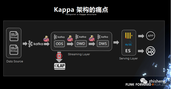 上述的結論可以被應用到當前熱門的實時數倉建設中。除了 Lambda 架構,當前實時數倉架構主要有 Kappa 架構和實時 OLAP 變體兩種[9],無論哪種通常都使用 Kafka/Pulsar 等 MQ 作為 ODS/DWD/DWS 等中間層的存儲,OLAP 數據庫或 OLTP 數據庫作為 ADS 應用層的儲存。這樣的架構主要問題在于不夠靈活,比如若想直接基于 DWD 層做一些 Ad-hoc 分析,那么常要將 DWD 層 MQ 中的數據再導出到數據庫再做查詢。