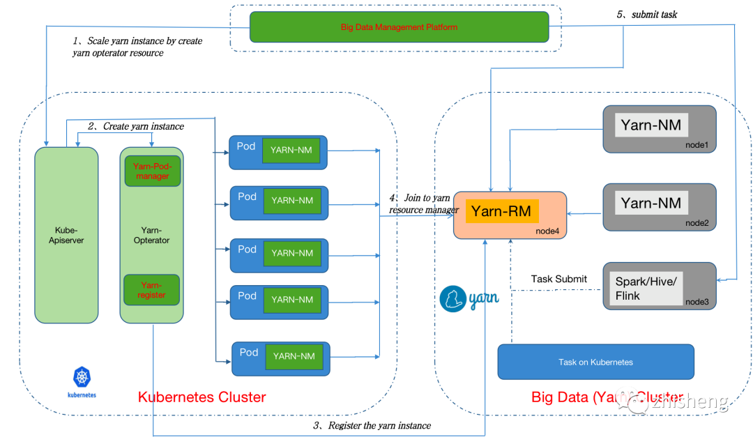 首先,統一在離線的集群管理器是混部的基礎。目前大多數公司是 k8s 與 YARN 并存的狀態,但在云原生的大趨勢下,大數據組件也逐步對 k8s 提供頭等的支持,看起來 k8s 一統集群資源只是時間問題。不過 k8s 的要做到這點也絕非一路平坦,一是 k8s 的一級調度設計并不能很好地滿足很多批計算作業的復雜調度,二是 k8s 當前能掌控的集群規模一般在 5000 節點左右,比起 YARN 差了一個量級[11]。因此在當前階段,業界大多是選擇 YARN on k8s 的方式來漸進式地遷移。常見的做法是在 k8s pod 里啟動 NM,讓 YARN 部分 NM 節點運行在 k8s 上。