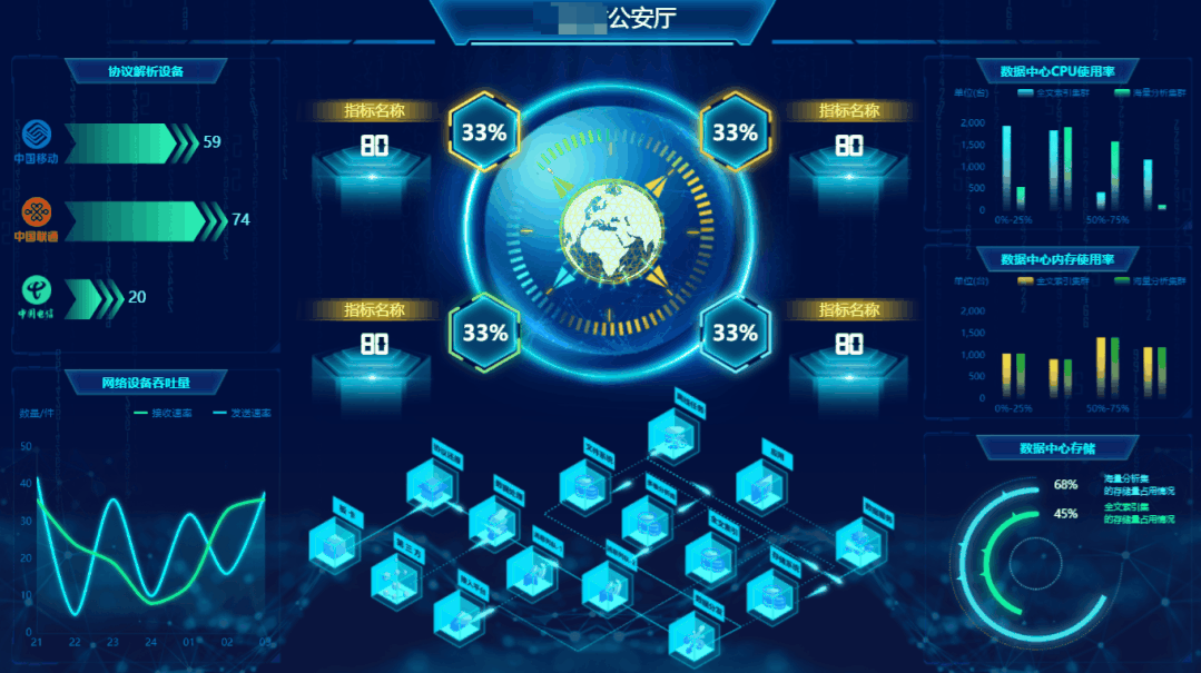 04 大屏可視化組件--輔助圖表 輔助圖表通常圍繞視覺中心的四周,起到錦上添花的作用,用來呈現次要指標,從各種維度進一步細化核心指標。 不需要設置任何數據,實時顯示的當下時間,并且以時鐘表盤的方式,古典有韻味。 05 大屏可視化組件--溫度計條形圖 條形圖是用寬度相同的條形的高度或長短來表示數據多少的圖形。借用溫度計的形象,生動展示數據占比的情況。 06 大屏可視化組件--3D網格線地球 有了這些組件,還怕做不出酷炫的大屏嗎?億信ABI值得擁有。 我們只需要在酷屏設計器拖拽組件即可實現,組件上的文本、數值全部支持界面化修改,方便我們快速轉化業(yè)務含義。