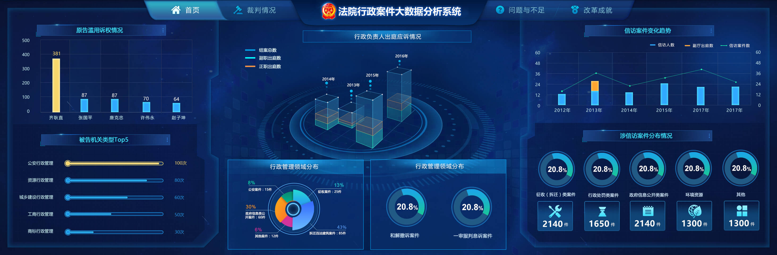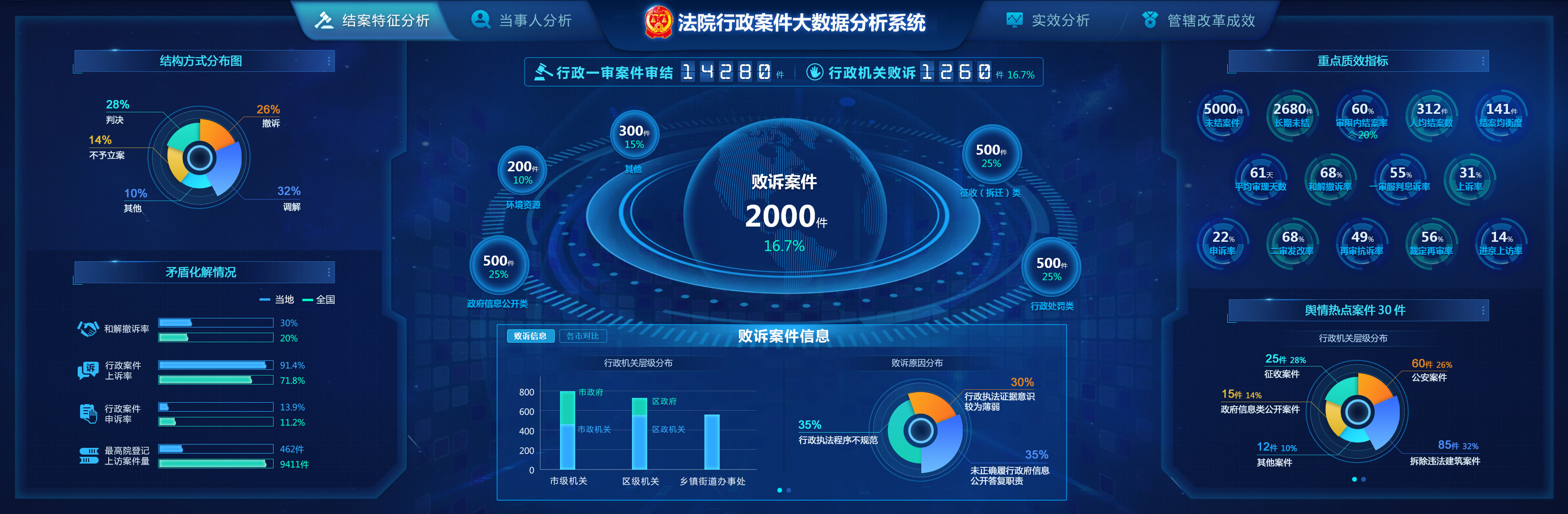法院行政案件大數據分析系統包含了結案特征分析、當事人分析、實效分析和管轄改革成效。通過收案/結案的數量和增幅,分別用時間、領域、地區(qū)等維度分析案件變化趨勢,從結構方式、矛盾化解情況、重點質效指標、輿情熱點案件、敗訴案件和敗訴案件信息來分析結案特征,用信訪案件變化趨勢和分布情況針對機關濫用職權情況來特別分析。不同分析角度分析不同數據,實現案件大數據全方位解讀。