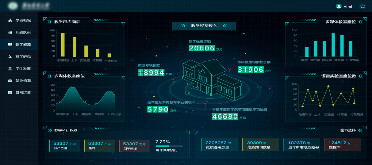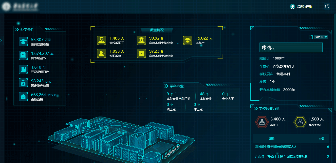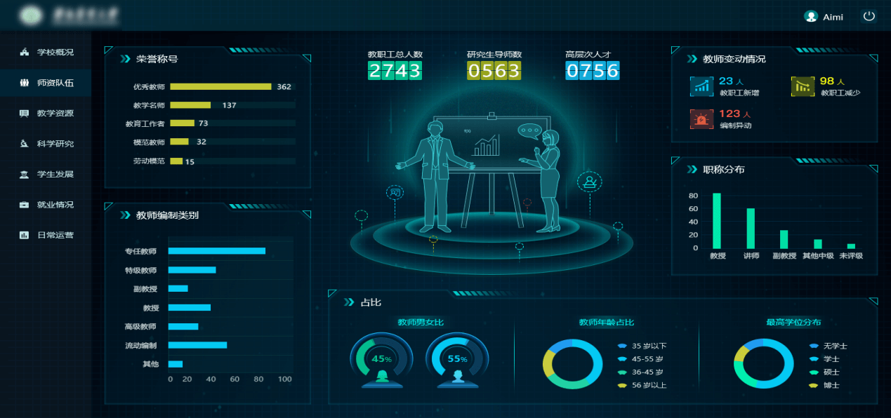 為了展現學校的實力,分別從學校概況、師資隊伍、教學資源、科學研究、學生發(fā)展、就業(yè)情況和日常運營的角度來展示。學校概況包括辦學條件、師生情況、學科專業(yè)和師資力量,再通過榮譽稱號、教師編制類別、教職工人數、研究生導師數、高層次人才、職稱分布、最高學位分布等展示師資隊伍,用教學用房面積、教學經費投入、教學科研儀器、圖書資料等來表現教學資源,用著作成果、獲獎成果、論文與專利等展現科學研究。