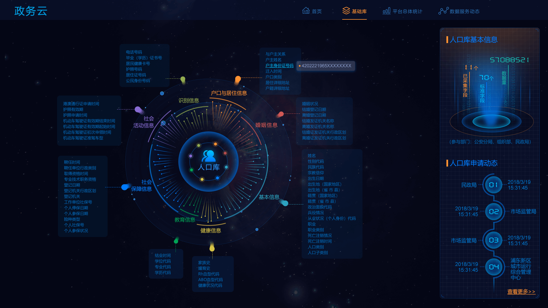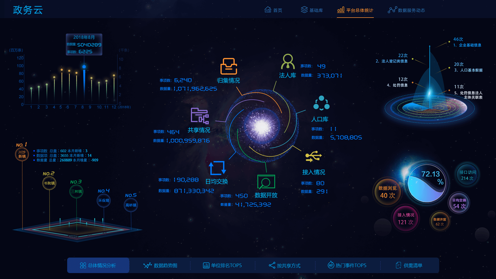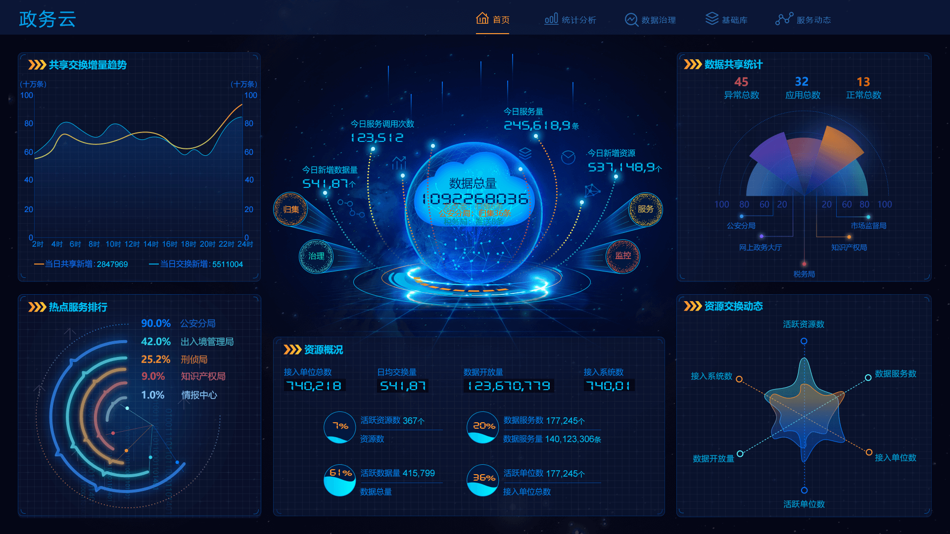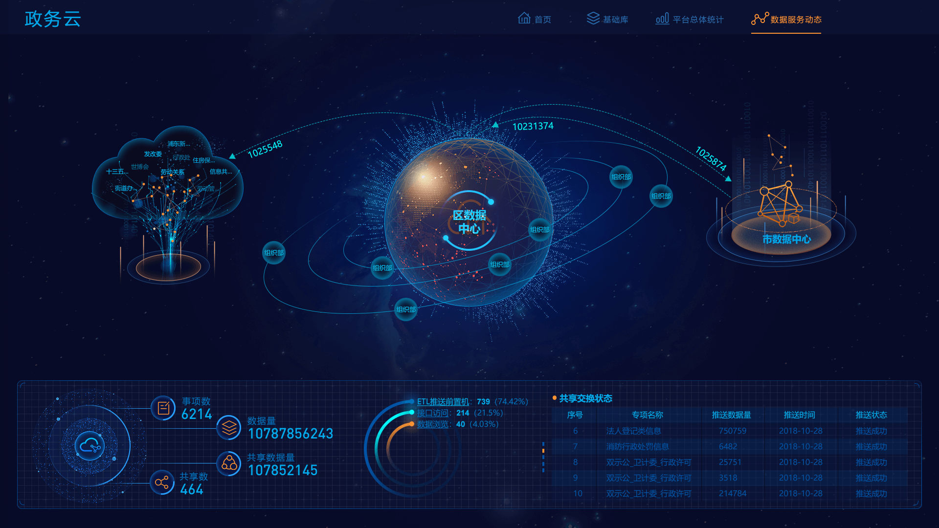 首頁展示共享方式占比、共享屬性占比、數據趨勢、熱門事項、和單位排名等,基礎庫包括人口庫、法人庫,支持搜索刷新,同時展示庫的基本信息和申請動態(tài),平臺總體統計展示平臺各類指標數據的訪問、更新情況,數據服務動態(tài)展現區(qū)數據中心和市數據中心等的數據實時交互狀況,實現數據全方位全時段把控。